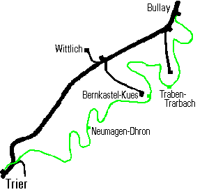 Streckeneröffnung: 2.4.1903 Trier - Leiwen 28.5.1903 Leiwen - Niederemmel-Piesport 29.12.1903 Niederemmel-Piesport - Andel 10.3.1904 Andel - Bernkastel 19.8.1905 Bernkastel - Bullay Ende des Personenverkehrs: 30.9.1961 Traben-Trarbach - Bullay 31.12.1962 Niederemmel-Piesport - Traben-Trarbach 21.5.1966 Neumagen-Dhron - Niederemmel-Piesport 31.1.1968 Trier - Neumagen-Dhron Ende des Güterverkehrs: 31.12.1962 Niederemmel-Piesport - Bullay - Abbau der Gleise 1963 21.5.1966 Neumagen-Dhron - Niederemmel-Piesport - Abbau der Gleise 1966 31.12.1967 Ruwer West - Neumagen-Dhron - Abbau der Gleise 1968 |